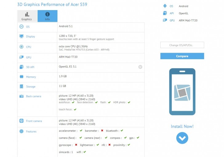 จากสเปคที่หลุดออกมาของ Acer S59 ผ่านการทดสอบ benchmark ของ GFXBench ก็จะเห็นได้ว่าสเปคของมันไม่ได้โดดเด่นถึงขนาดเรือธง มาพร้อมชิป Mediatek MT6573 octa-core 1.3GHz, หน่วยความจำ 16GB และ RAM 2GB