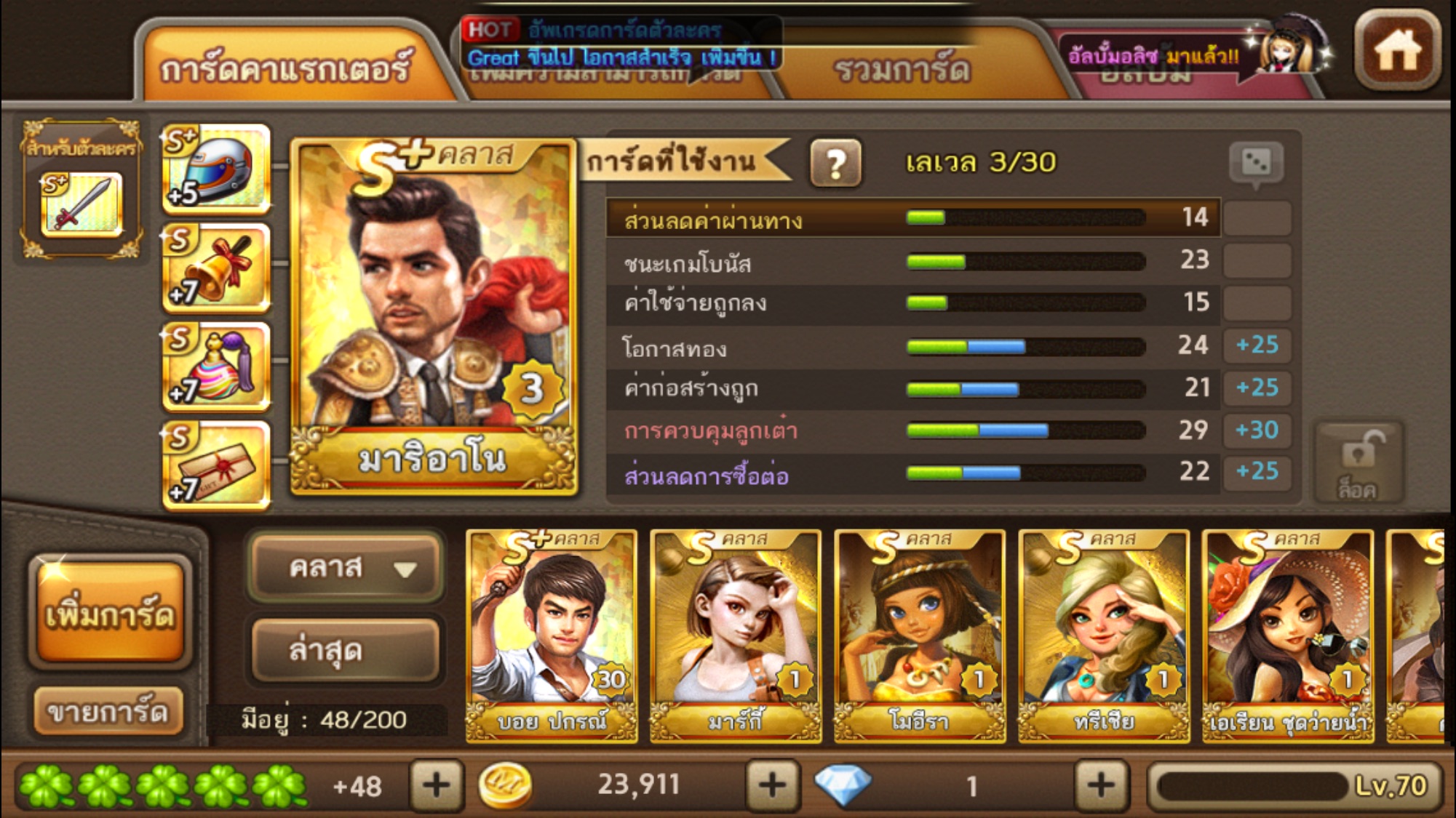 ช่วงนี้รู้สึกอยู่ในวงจรอุบาทก์ของเกมเศรษฐีมากไปครับ สเตตัสก่อนเลิกคือ Lv56 โคโค่ S25 ลูกเต๋าเฟืองโลหะ เพชร 3261 ทอง 1,350,127 เครื่องรางมีการ์ดดำ A5 ไม้กายสิทธิ์ A+5 อูคูเลเล่ A+5 หมวกกันน็อก S5 - ได