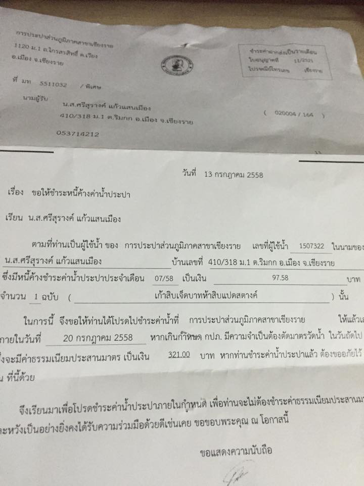 แจ้งว่า ค้าง ชำระค่า น้ำปะปา ระบุวันที่ 13 กรกฎาคม 2558
