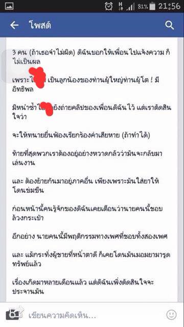 สวัสดีค่ะ นี่ยืมกระทู้เพื่อนมาเขียนมาขอความเป็นธรรมให้พี่ชายค่ะ เข้าเรื่องเลยนะคะ คืออีกไม่กี่วันพี่ชายก็จะบวชแล้วก็มีเรื่องวุ่นวายเข้ามาคือมีผู้หญิงรายหนึ่งคือผู้ใช้เฟสบุ้คได้ทำการโพสต์ให้พี่ชายของหนูเสียหายเป็นอย่างมาก ซึ่งดิฉันเองก็ตกใจ เพราะรู้จักนิสัยตัวพี่ดีเพราะอยู่ด้วยกันมาตั้งแต่เด็กพี่ปกป้องและคอยดูแลเอาใจใส่ไม่มีทางเป็นอย่างที่ผู้หญิงนิรนามคนนั้นมาโพสต์แน่นอนค่ะ แล้วอีกอย่าง พี่ชายของดิฉันก็มีแฟนที่คบกันมาหลายปีและอีกไม่นานก็จะแต่งงานกันแล้ว และอีกอย่างพี่จะโดนสังคมมองยังไงไปทำงานเขาจะเกิดปัญหาคือเป็นห่วงพี่มากๆค่ะ ขอบคุณทุกคนนะคะที่ช่วยกันขอบคุณที่ฟังความทั้งสองด้านแต่หนูยืนยันเลยค่ะ พี่หนูเป็นคนดีจริงๆ