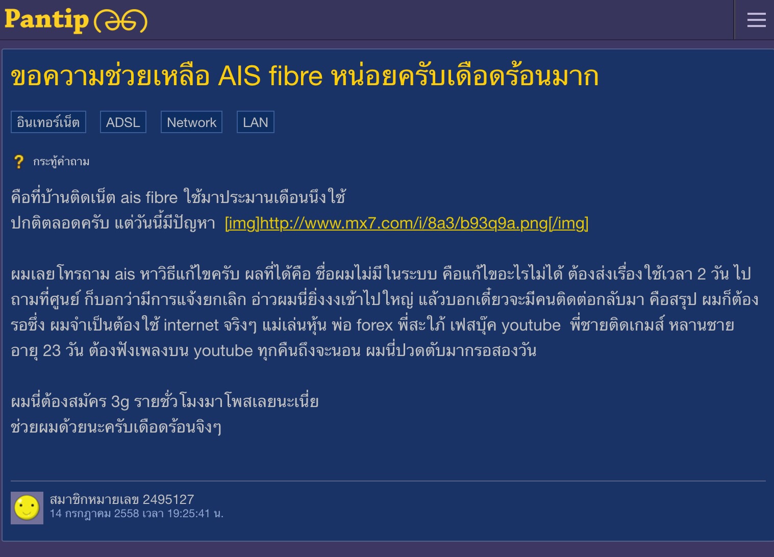 มาถึงปัญหาที่ผมทนไม่ได้จิง คือเมื่อวันจันทร์ช่วงเที่ยง เน็ตเน่า ใช้ไม่ได้เลย ก็ไม่ได้ติดต่อใคร รอเอา เพราะที่เคยใช้ๆมา แป๊บๆมันก็ใช้ได้เอง แต่ที่ไหนได้ ใช้ไม่ได้เลย ให้น้องกับแม่ไปที่ais aisบอกว่าหมายเลขนี้มีการแจ้งยกเลิก ซึ่งชื่อคนติดตั้งเป็นชื่อแม่ ตอนนี้ใช้ไม่ได้ มีคนแจ้งยกเลิกแต่เป็นชื่อใครก็ไม่รู้aisบอก ต้องรอเค้าเช็คข้อมูลให้อีกที แม่กับน้องก็กลับมาบ้านแบบงงๆ ผมเลยบอกให้โทรไป1185 พนง.ก็บอกว่า ไม่มีชื่อแม่อยู่ในระบบเลย อ้าวงง งงกว่าเก่า ทีนี้ก็ทำไรไม่ได้สิคับ ทางนั้นเลยให้เบอร์ช่างมา น้องผมคุยกับช่าง ถ้าโดนตัดจิงๆก็ปล่อยสัญญาณให้ใช้ก่อนได้มั๊ย จำเป็นต้องใช้จิงๆ ช่างบอกตอนนี้ระบบมีปัญหา คนอื่นเค้าก็เป็น เดี๋ยวใช้ได้เมื่อไหร่จะติดต่อกลับที่บ้านผมก็รอ รอ รอ จนวันนี้ตอนบ่ายผมโทรไปอีก เค้าก็บอกว่าหมายเลขผมเนี่ยไม่มีในระบบ พอพูดไปพูดมา เค้าบอกว่ากำลังเร่งดำเนินการให้อยู่เพราะทำเรื่องไว้แล้ว ใช้ได้เมื่อไหร่จะติดต่อกลับ(อีกแล้ว) ผมเลยถามว่าแล้วที่อุดร คนอื่นเขาเป็นมั๊ย ได้คำตอบว่า ไม่ได้มีปัญหาที่อุดร แต่มีปัญหาที่หมวดตัวเลข บางหมวดก็ใช้ไม่ได้แบบผม เดี๋ยวยังไงจะติดต่อกลับนะครับ ผมเลยถามไปว่า พี่คับ พี่ทำงานเนี่ย ถ้าอินเตอร์เน็ทใช้ไม่ได้ พี่จะทำงานได้มั๊ยคับ เค้าก็ว่าเค้าเข้าใจ แล้วจะติดต่อกลับนะคับ แล้วก็ๆๆๆๆๆ จนป่านนี้ ยังเงียบ ยังใช้ไม่ได้เลย แถมไม่มีใครให้คำตอบได้ว่ามันเสียยังยังตรงๆหนแก้ยังงัยแก้ถึงไหน