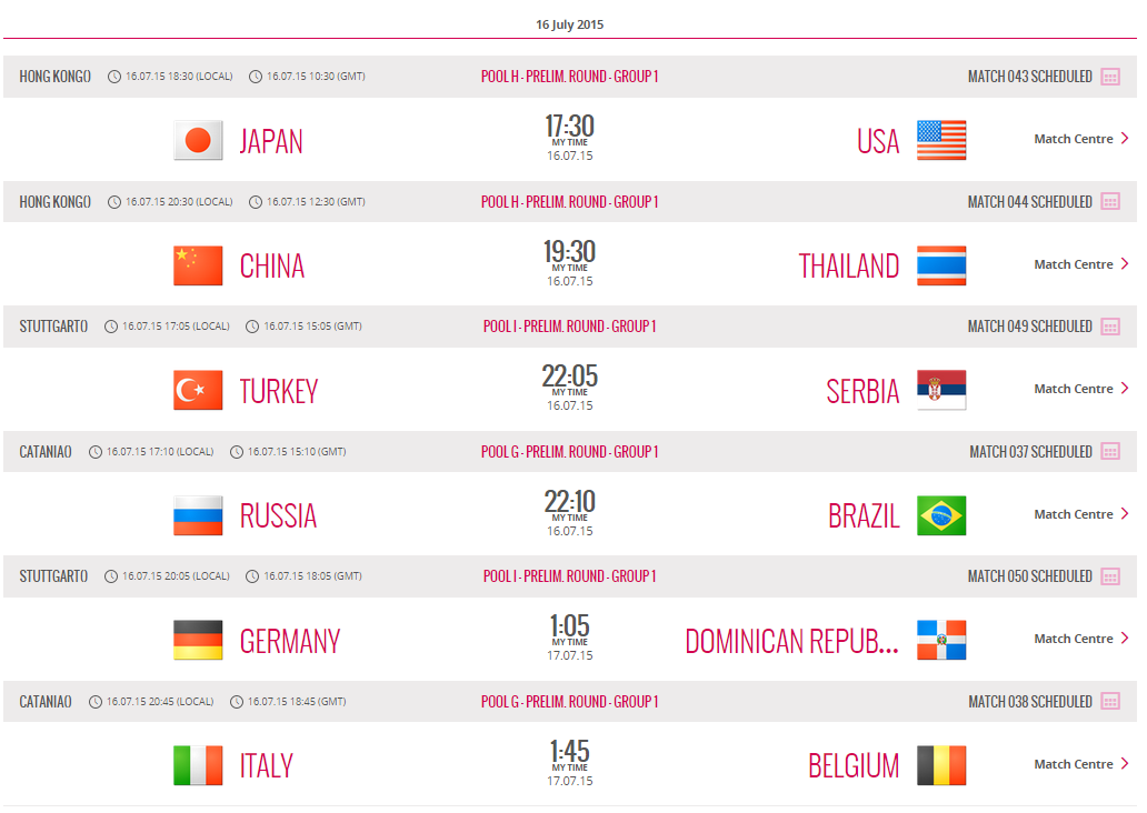 โปรแกรมการแข่งขัน FIVB VOLLEYBALL WORLD GRAND PRIX 2015 วันที่ 16 กรกฏาคม 2558