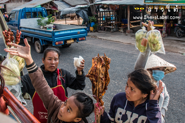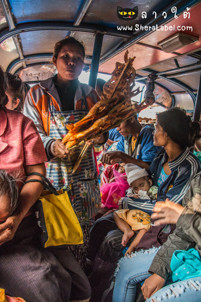 ถึงจุดพักรถ มีเด็กเล็กเด็กโตถือไก่ย่าง ข้าวเหนียว หมูยอ