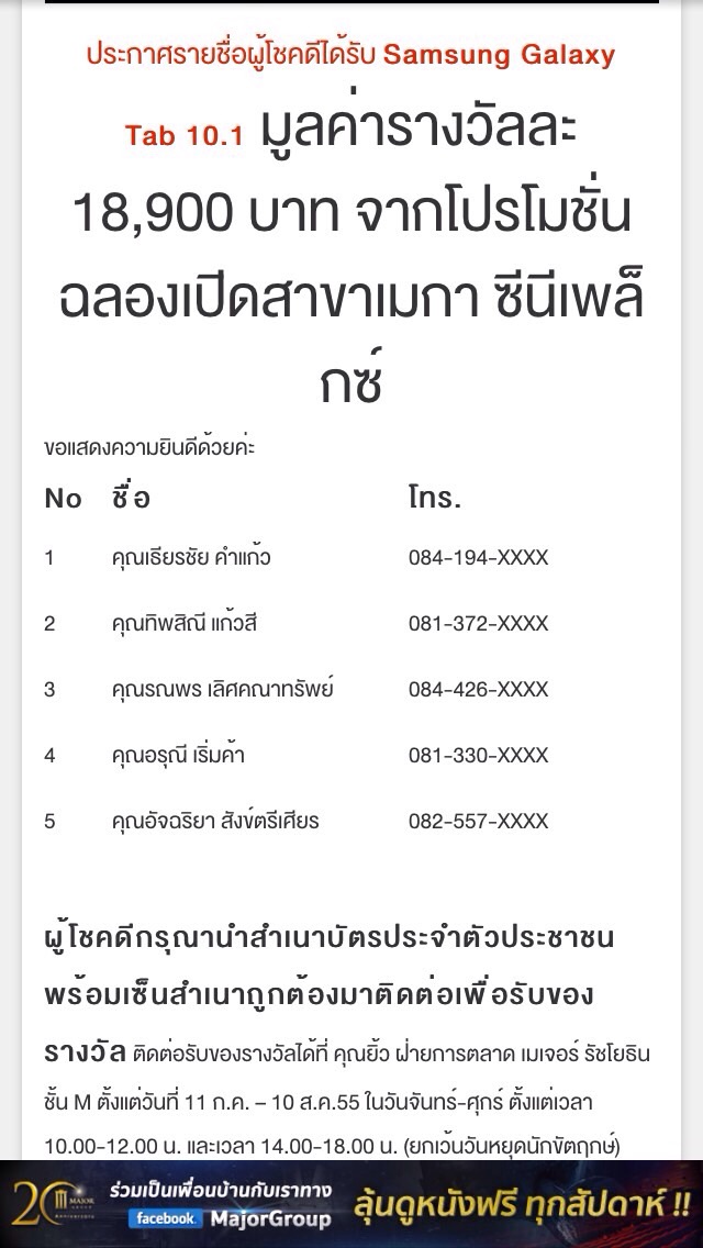 ภรรยาผมถูกรางวัลของเมจอร์ เมกาบางนา ตอนเปิดห้างใหม่ๆได้ galaxy tab แต่ไม่มีใครแจ้งภรรยาผมว่าถูกรางวัล แล้วยังงี่ใครจะไปรู้!!