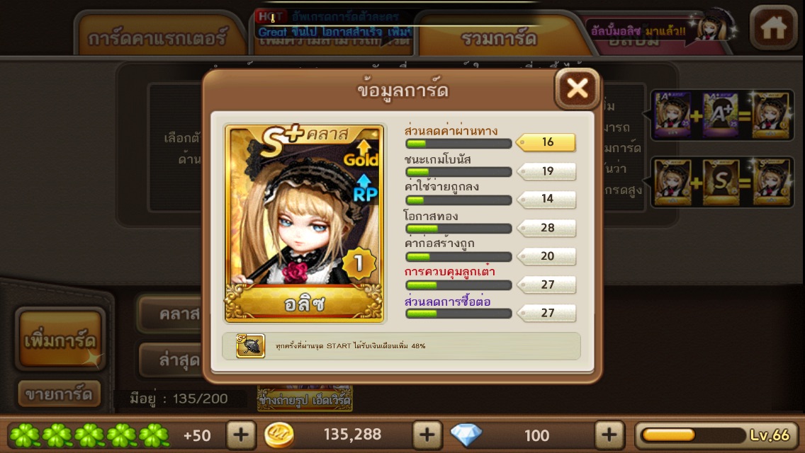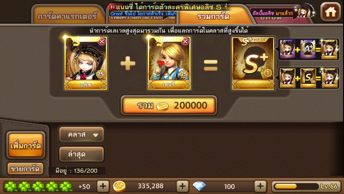 ของผม เปิดแพคการ์ดได้แต่ของกากๆ ได้ A+ มา 2 ใบ ถือว่าดีมาก ช่วงอีเว้นท์เก่าๆเปิดเจอ A+ ได้เพชรฟรี ผมเปิดไป 2-3 แพค ไม่โผล่ซักตัว ตั้งแต่เปิดมา ได้ S ใบเดียว ตัวอื่นได้จากของฟรี รวมการ์ด ลูกบาศก์ หลังๆ
