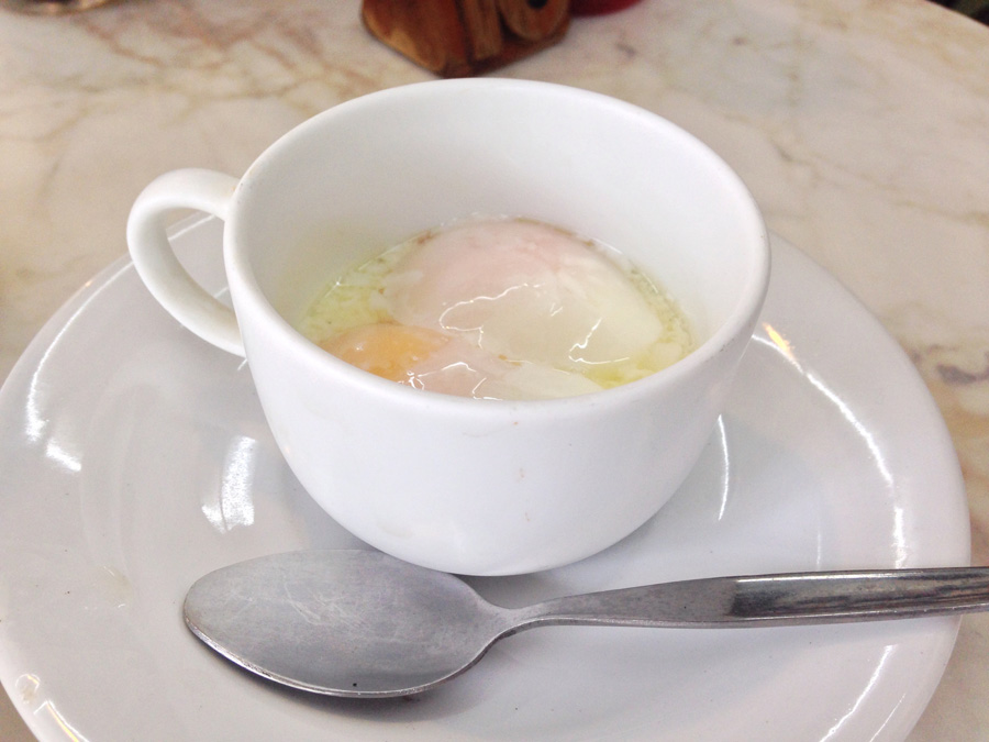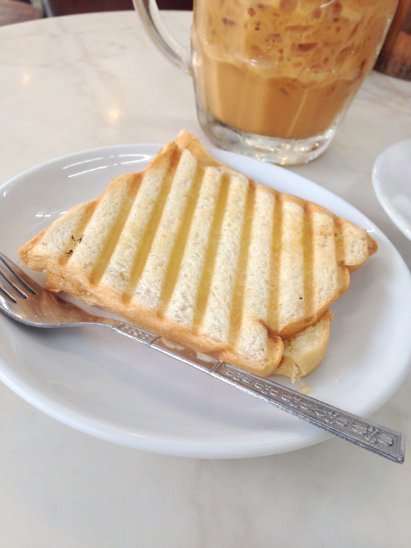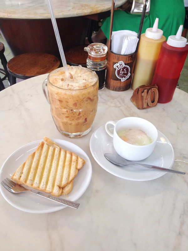 ในชุดมี ขนมปังน้ำตาล ไข่ลวกสองฟอง กับชาเย็นครับ