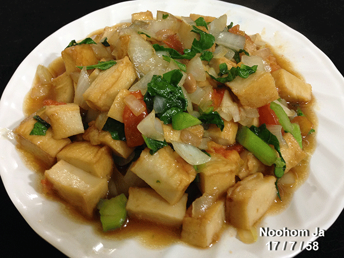 ตั้งกะทะ ใส่น้ำมัน เจียวกระเทียม ก่อนเอาเต้าหู้ลงผัด ตามด้วย หอมหัวใหญ่ มะเขือเทศ ปรุงรสด้วยซอสปรุงรส น้ำปลา น้ำตาล ตามชอบ ใกล้สุกใส่ใบคะน้าลงผัด