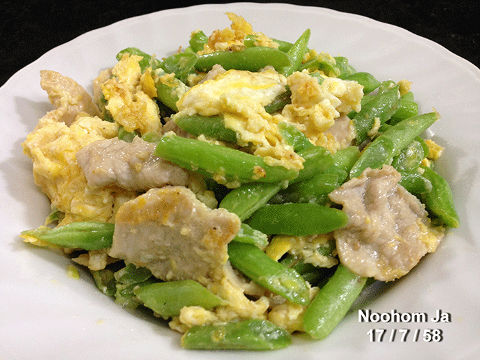 ได้ถั่วแขกมาถุงหนึ่ง 10 บาทเอามาล้างหั่นแฉลบๆ ทุบกระเทียม ตั้งกะทะ เจียวกระเทียม ใส่หมูลงไปพอประมาณ ปรุงรสด้วยซอสปรุงรส น้ำปลา น้ำตาล พอใกล้สุก เอาถั่วลงผัด คลุกทุกอย่าง เข้าด้วยกัน ดันไว้ข้างกะทะ ตอกไข่ลงกะทะสองฟอง ทอดจนเกือบสุก ก่อนที่จะเอาถั่วมาคลุกไข่