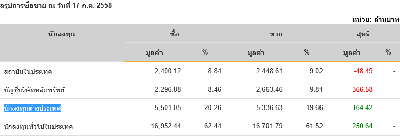 Sinthorn Summary 17/7/2558 : ต่างชาติซื้อสุทธิ 164.42 ลบ.