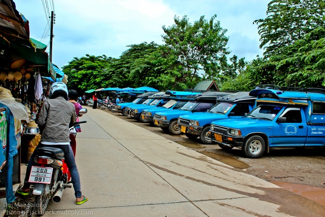 (แต่ความจริงที่แจ๊คหาข้อมูลมาเค้าบอกรถสองแถวจากตลาดแม่จัน60บาท แจ๊คก็ยังงงๆ และเพิ่งมาถึงบางอ้อตอนวันกลับ คุณป้าเจ้าของลิตเติ้ลโฮมที่แจ๊คไปพัก เรียกรถมาให้ เป็นรถสองแถวสีเขียว และ ลงคนละทางกับที่แจ๊คมา อ่อ มันมีคิวรถ2คิว และขึ้นได้2ทาง เราไปขึ้นรถผิดคิวนี่เอง 5555)