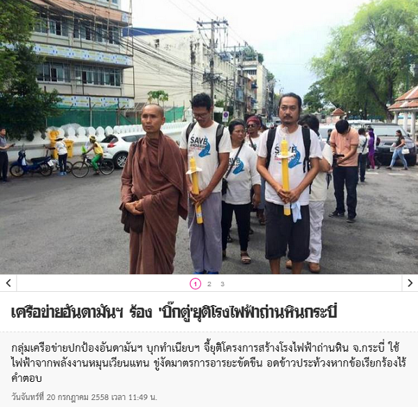 ที่มา : ผู้จัดการ ศูนย์ข่าวภาคใต้ - เครือข่ายอันดามันจากถ่านหิน ยืนยันยังคงเดินหน้าเคลื่อนไหวโดยสันติเพื่อหยุดโครงการโรงไฟฟ้าถ่านหินกระบี่ต่อไป แม้นายกฯ จะบอกว่าให้มีการชะลอโครงการไว้ก่อน โดยตัวแทนเค