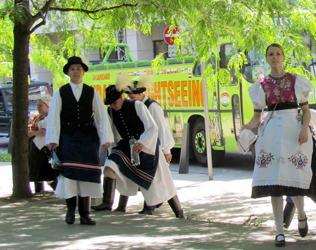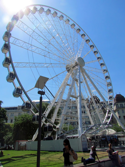 จากบ้านเดินไปนิดเดียวก็ถึงสถานีเมโทร เราซื้อตั๋วแบบ 24 ชม. ที่ใช้ได้กับเมโทร บัสและแทรม ราคา 1650 HUF พอขึ้นจากสถานีมา บาร์บี้ก็พาเราเดินผ่านเมือง ผ่านสวนสาธารณะ ที่มีชิงช้าสวรรค์อยู่ แล้วเราก็เห็นคนใส่ชุดประจำชาติด้วย