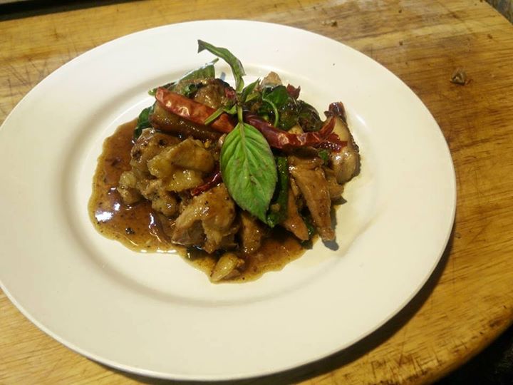 พอดีคอหมูย่างเหลือ ไม่รู้จะทำอะไรกินดีเลยนำมาทำเมนูนี้ซะเลย คอหมูย่างผัดพริกแห้งโหระพา