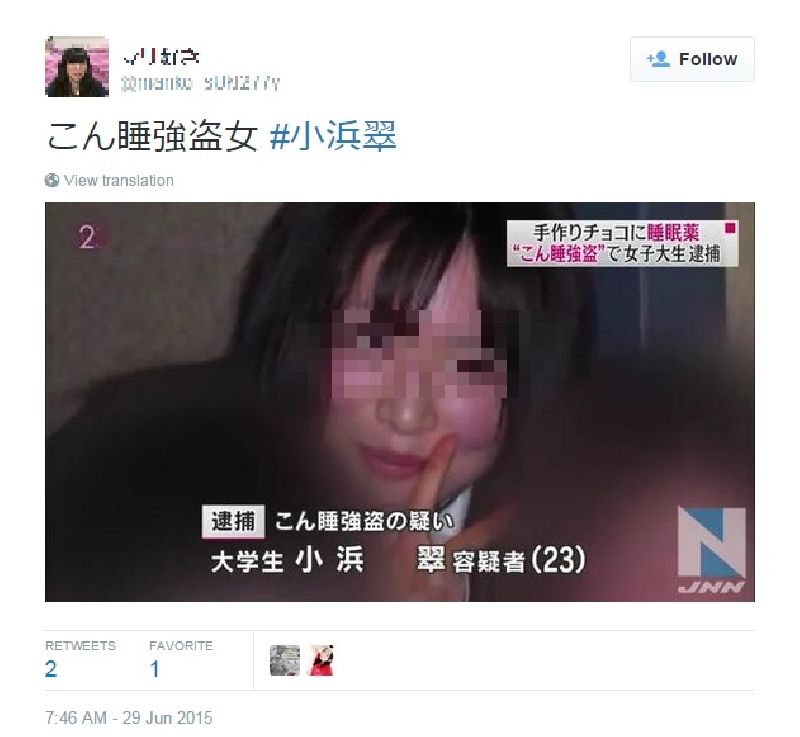 จากรายงานของ Rocket News 24 คุณลุงวัย 52 ปี จากย่านมิยากิโนะ ในเมืองเซนได ประเทศญี่ปุ่น ได้นัดพบกับ มิโดริ โคฮามะ สาววัย 23 ปี นักศึกษาปี 6 ของมหาวิทยาลัยเภสัชกรรมโตโฮคุ ผ่านเว็บไซต์หาคู่ โดยทั้งคู่ได้นัดทานอาหารเย็นด้วยกันเมื่อวันที่ 24 มิถุนายนที่ผ่านมา ก่อนที่นักศึกษาสาวจะมอมยาปลดทรัพย์คุณลุงไป