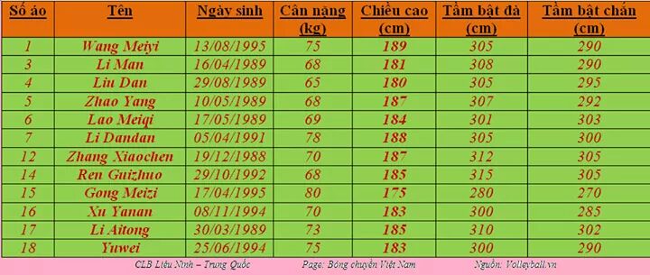รายชื่อสโมสร Liaoning รายการ VTV Cup 2015