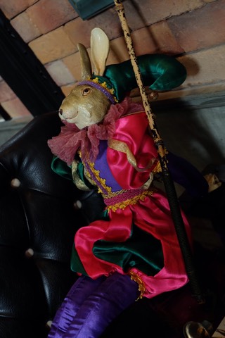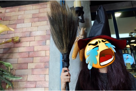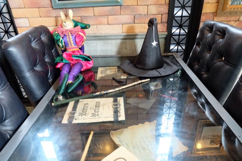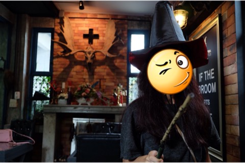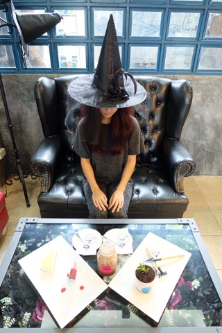 เดินเข้าร้าน ก็เจอโต๊ะที่ตกแต่งด้วยงานสไตล์เวทมนตร์ แม่มด มีไม้กายสิทธิ์ มีหมวกแม่มดพ่อมดให้ใส่ด้วยนะคะ