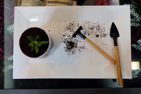 เมนูนี้จะมีลักษณะเป็นกระถางต้นไม้ค่ะ ข้างในเป็นเค้กช๊อคโกแลต มีถั่วแมคคาเดเมียข้างใน กรุบๆดีค่ะ แต่ชอบตรงไอเดียนี่แหละ เสิร์ฟพร้อมส้อมพรวน และช้อนพรวนค่ะ
