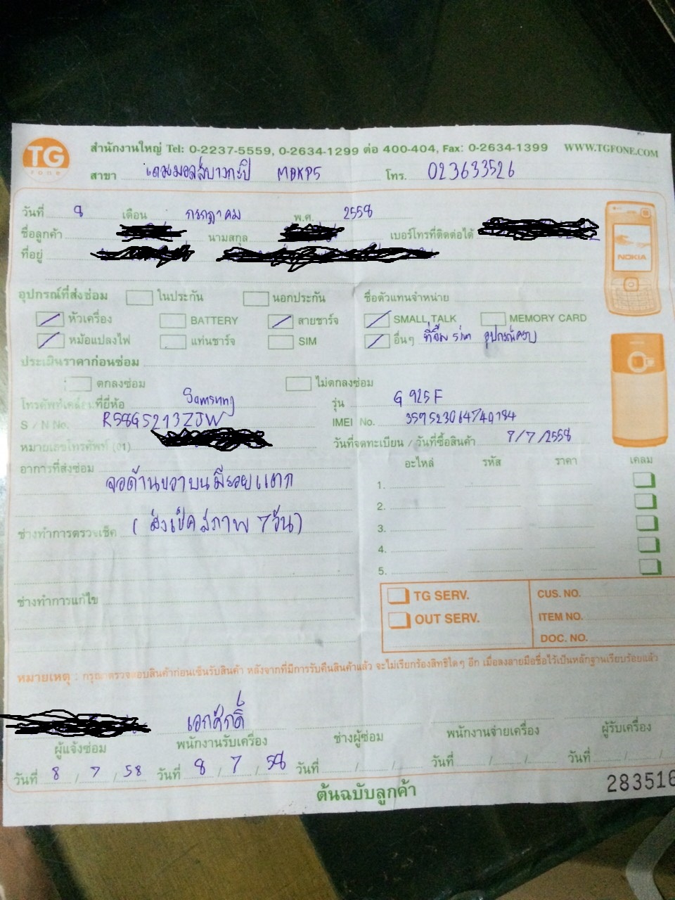 วันที่ 20 กรกฎาคม 2558 ตอนนี้ผ่านมา 12 วันแล้ว เราโทรไปถามทาง TG Fone ก็บอกว่ายังไม่แจ้งเรื่องกลับมาน่าจะให้คำตอบไม่เกินพรุ่งนี้ แต่เดี๋ยวจะมีเจ้าหน้าที่ซัมซุงโทหา สักพัก Samsung โทรมาจริงค่ะ เป็นช่างที่ตรวจสอบเครื่องโทรมาสอบถามว่าตอนรับเครื่องไปสภาพเป็นยังไง แล้วก็ให้เราเล่าเหตุการณ์ให้ฟัง จากนั้นก็แจ้งว่าตรวจแล้วเครื่องเราไม่พบการตกหล่นจริง แต่หากเป็นการกระแทกทางเค้าไม่สามารถตรวจสอบได้ หากเค้าส่งเรื่องไปที่สำนักงานใหญ่สรุปว่าลูกค้าทำกระแทก ลูกค้าอาจต้องมีค่าใช้จ่าย เราได้ยินแบบนั้นเราขึ้นเลย เราบอกว่าเราไม่ยอม เพราะเราไม่ได้ทำตก ไม่ได้ทำกระแทกดูแลอย่างดี เราจะไม่ยอมรับผิดชอบในสิ่งที่เราไม่ได้ทำ เราจะไปฟ้อง สคบ.พนักงานคนนั้นบอกว่าเค้าไม่สามารถตัดสินใจได้ เราเลยเงียบลงพยายามจะเข้าใจพนักงานคนนั้น ทีนี้เราก็ต้องมารอดูว่าทาง Samsung จะรับผิดชอบเรายังไง??? และอยากปรึกษาเพื่อนๆว่าเราควรทำไงต่อไปดี เสียทั้งเงินเสียทั้งความรู้สึก