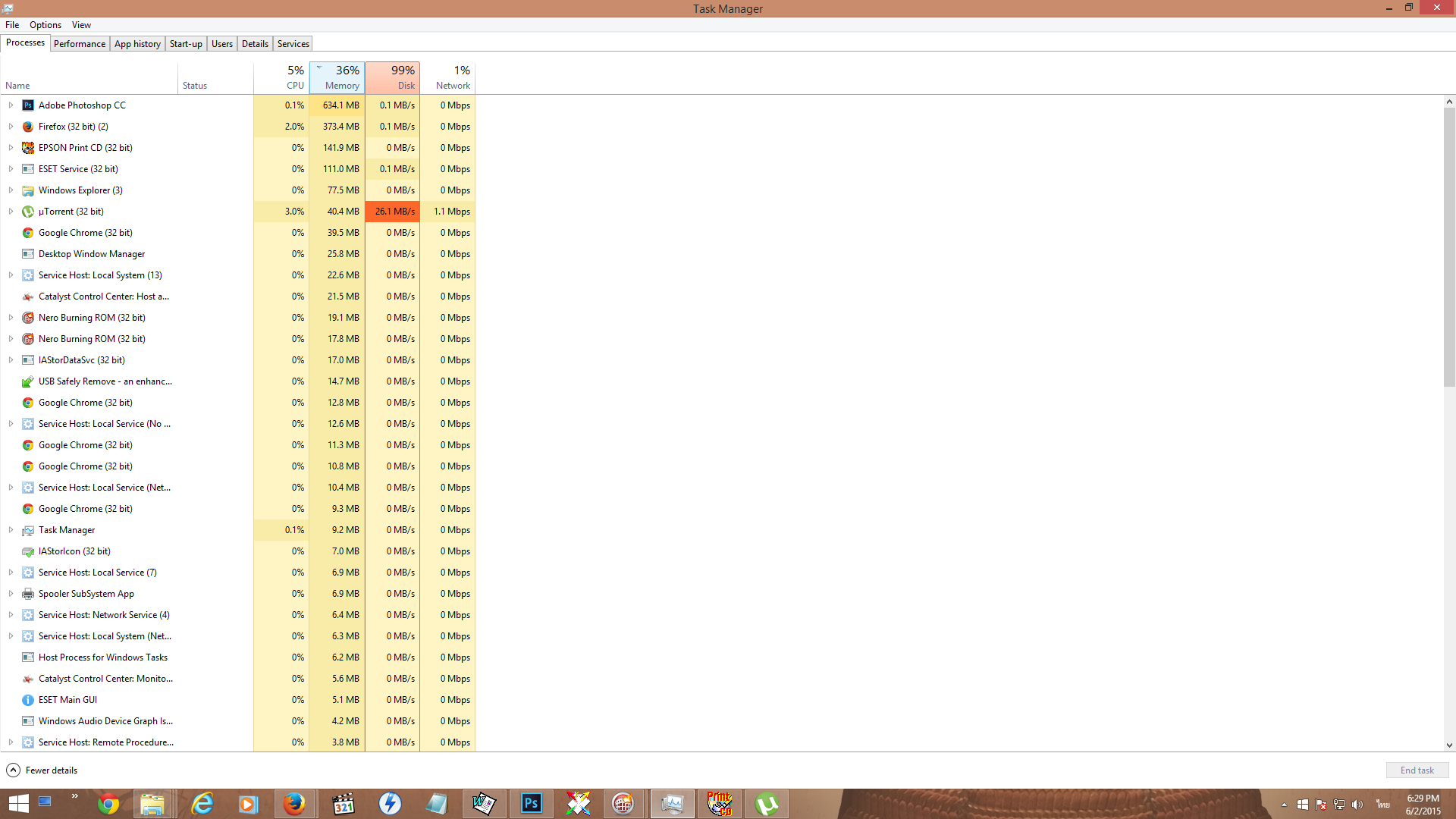 อาการประมาณว่าเวลาใช้โปรแกรมอย่าง Utorrent ตอนที่โปรแกรมกำลังเช็คแฮท Disk จึงวิ่งจนขึ้น 100 เป็นสีแดง วิ่งทีเป็น 10-20 MB พอเช็คเสร็จมันก็ลดลง กับโปรแกรมอื่นก็คล้าย ๆ กัน อย่างพวก Photoshop กับ Lightroom พอเปิดใหม่หรือพับไว้แล้วสั่งเรียกขึ้นมาใหม่มันก็เป็น Disk พุ่ง 99 - 100 แดง บางที Chrome ก็มีเป็นเหมือนกันครับ ขอบคุณที่อ่านครับ