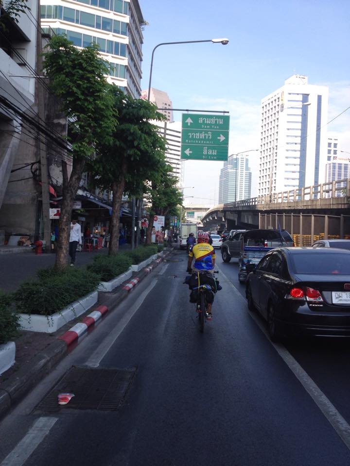 7.30 น. หลังจากเตรียมทุกอย่างเสร็จเรียบร้อยก็ออกเดินทางกันได้ ระยะทางประมาณ 30 กิโลเมตร ถือว่าไม่มากและไม่น้อยสำหรับการปั่นจักรยาน แต่ติดอยู่ว่าปั่นในเมืองด้วย วันทำงานด้วย ชั่วโมงเร่งรีบของคนเมืองด้วย เลยทำให้จักรยานบนถนนปั่นได้ไม่ค่อยสบายเท่าไรนัก (แท็กซี่วิ่งลิ่ว สองแถวก็มา รถตู้ก็ดี รถเมล์ฟรีห้ามแซงเด็ดขาด !!)...
