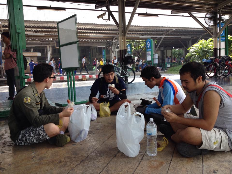 10.30 น. แล้วก็มาถึงสถานีรถไฟหัวลำโพง สิ่งแรกที่หลายคนจะทำคือ “ซื้อข้าว” เนื่องจากออกกันมาตั้งแต่เช้ายังไม่ได้กินข้าวกันเลย จากนั้นก็ทำการซื้อตั๋วรถไฟ(รอบนี้ฟรี พี่ไม่คิดตัง) .. 7 คน ก็ 7 ที่จัดไป
