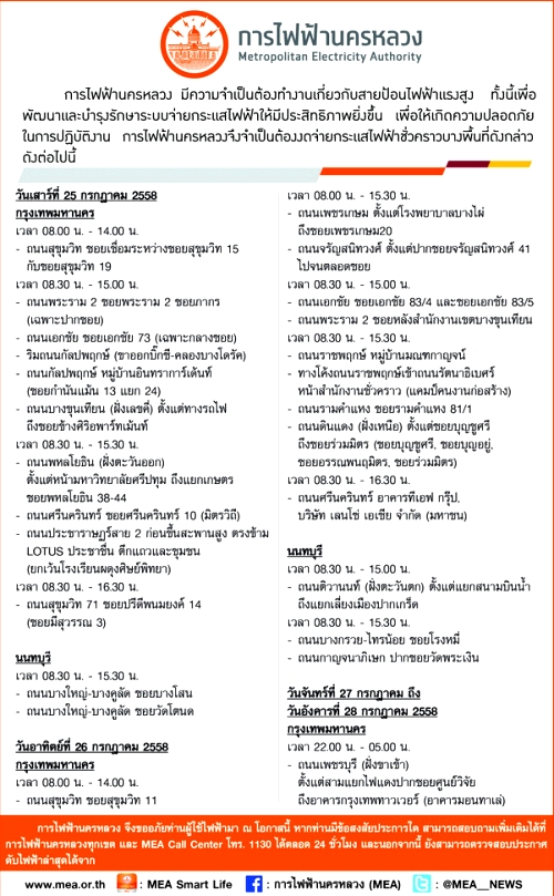 การไฟฟ้านครหลวง ประกาศงดจ่ายกระแสไฟฟ้าชั่วคราวในบางพื้นที่ของ กทม.และ นนทบุรี ช่วงวันที่ 25-28 ก.ค.2558