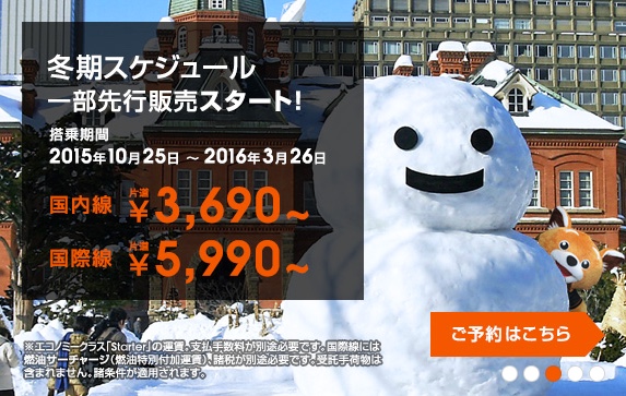 ถึงแม้ผมไม่รู้ภาษาญี่ปุ่น แต่ผมก็เดาได้ว่า ตอนนี้เปิดให้จองตั้งแต่ 25 ตุลาคม 2015 - 26 มีนาคม 2016 (ซึ่งสายการบินอื่นตอนนี้เปิดให้จองได้ถึงแค่ 24 ตุลาคมเท่านั้น) และราคาก็น่าคบ 3,690 - 5,990 Yen ต่อขาเท่านั้นเอง