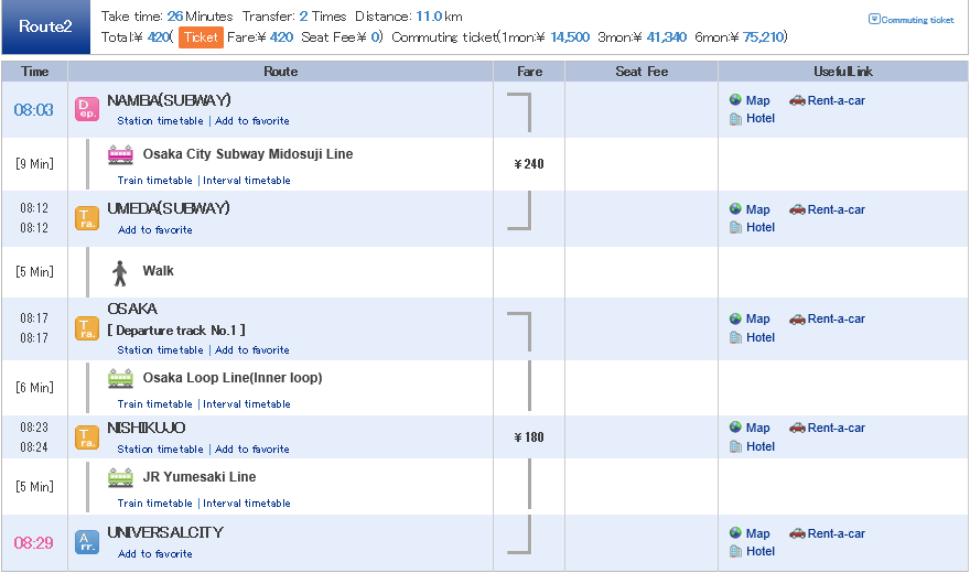 - เค้ากะให้ขึ้นโดยตามเวลาที่เร็วที่สุดในแบบของคนญีปุ่่นครับ เค้าไมไ่ด้คำนวนให้เราเผื่อหลงไว้ด้วย (วิธีทดลอง ให้เลือก สถานีแค่จาก osaka >> universal แล้วเลือกช่วงเวลา มันก็จะมีช่วงเวลาถัดๆๆไปขึ้นมาครับ) ทีนี้เราก็จะรู้ว่า ถ้าตกรอบนี้ รอบถัดไปกี่โมง