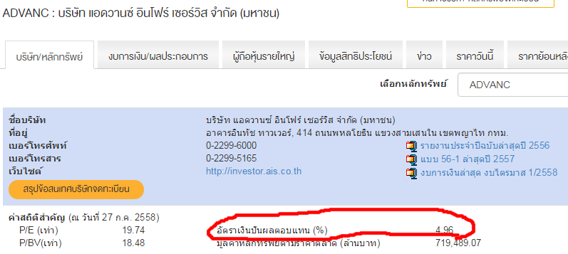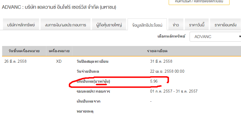 ปันผลเทียบจากการจ่ายปันผลทั้งปีของหุ้นตัวนั้นครับ ADVANCE ปันผลปีละ 2 ครั้ง