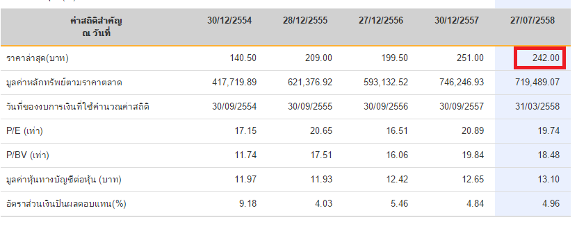 จะเห็นว่าค่าล่าสุดเค้าใช้ราคาของวันที่ 31/3/2558 ซึ่ง = 242 บาท