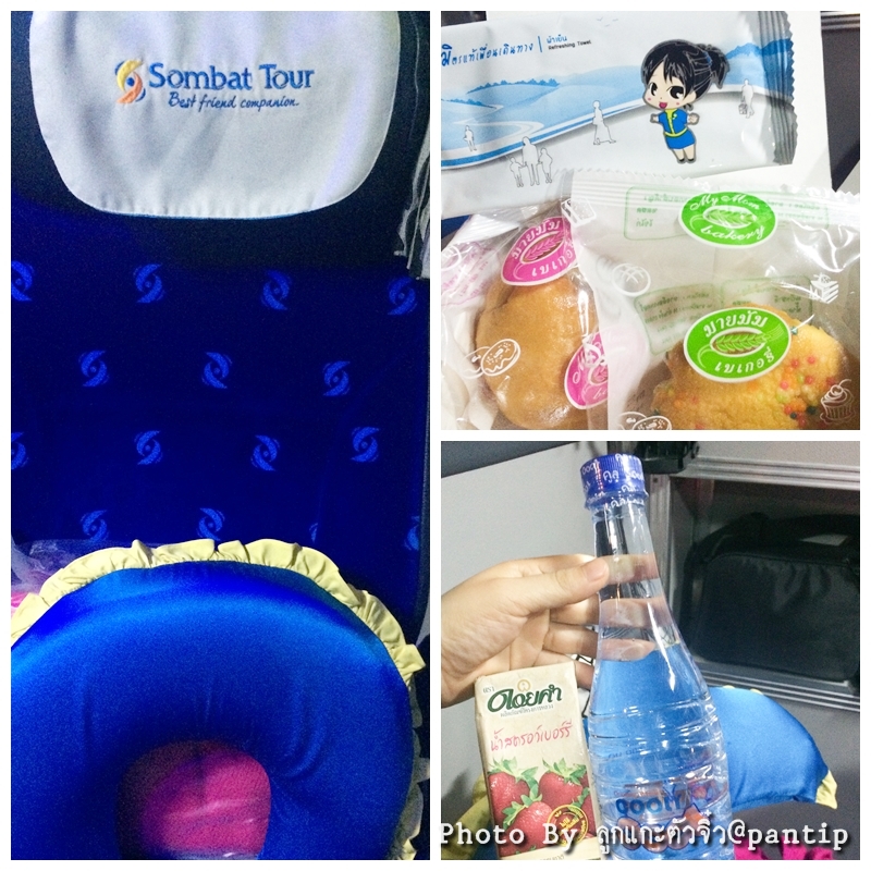 ถึงเวลาทุ่มครึ่ง เราก็รีบขึ้นรถไปนั่งประจำที่ มาดูบนรถทัวร์กันค่ะ มีหมอนรองคอ ผ้าห่ม น้ำเปล่า 1 ขวด น้ำผลไม้ 1 กล่อง ขนม 2 ชิ้น ผ้าเย็นให้