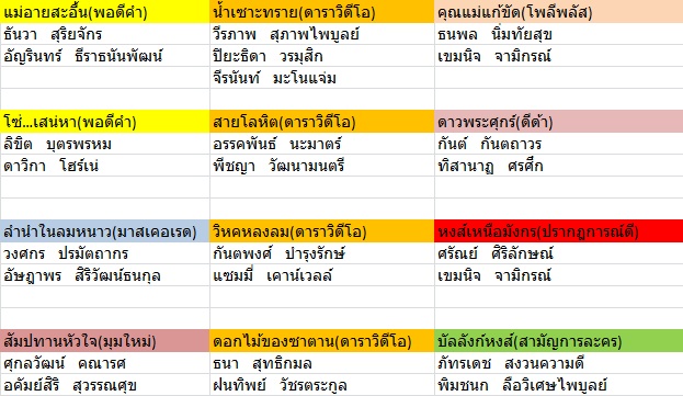 เคลลี่ ธนะพัฒน์ > น้ำเซาะทราย / เพลิงพระนาง / เสน่หามายา / ละอองดาว / วิหคหลงลม เวียร์ ศุกลวัฒน์ > คู่ซ่ารสแซ่บ / สัมปทานหัวใจ / ซีรี่ส์ภารกิจรัก มิกค์ ทองระย้า > นักบุญทรงกลด (ปิดกล้อง) /