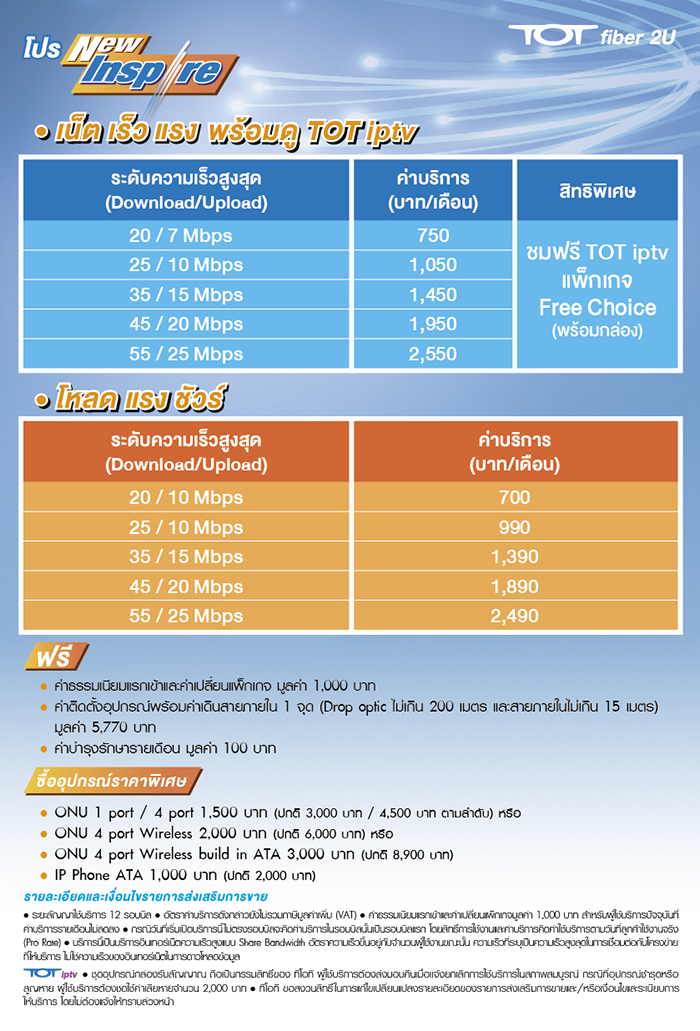 โปรใหม่ fiber2u TOT 20/10 ราคา700บาท