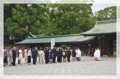 ศาลเจ้าที่นี่เป็นสถานที่ที่คนญี่ปุ่นนิยมมาทำพิธีแต่งงานกันที่นี่ค่ะ โชคดีว่าตอนที่เราไปกำลังเริ่มพิธีกันพอดีเลย