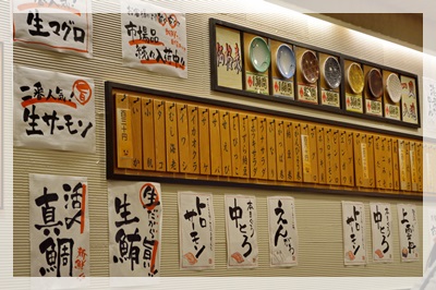 อาหารที่นี่ก็ตามสไตล์ซูชิหมุน ที่แบ่งราคาตามสีของจาน โดยเริ่มตั้งแต่ 130 เยนค่ะ