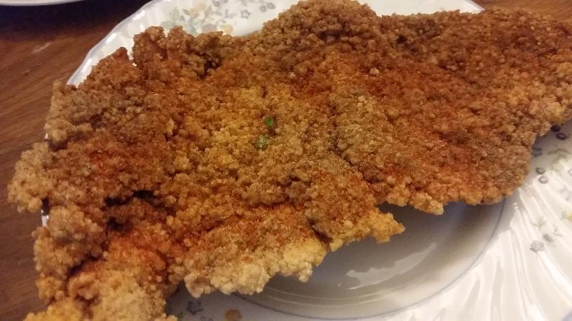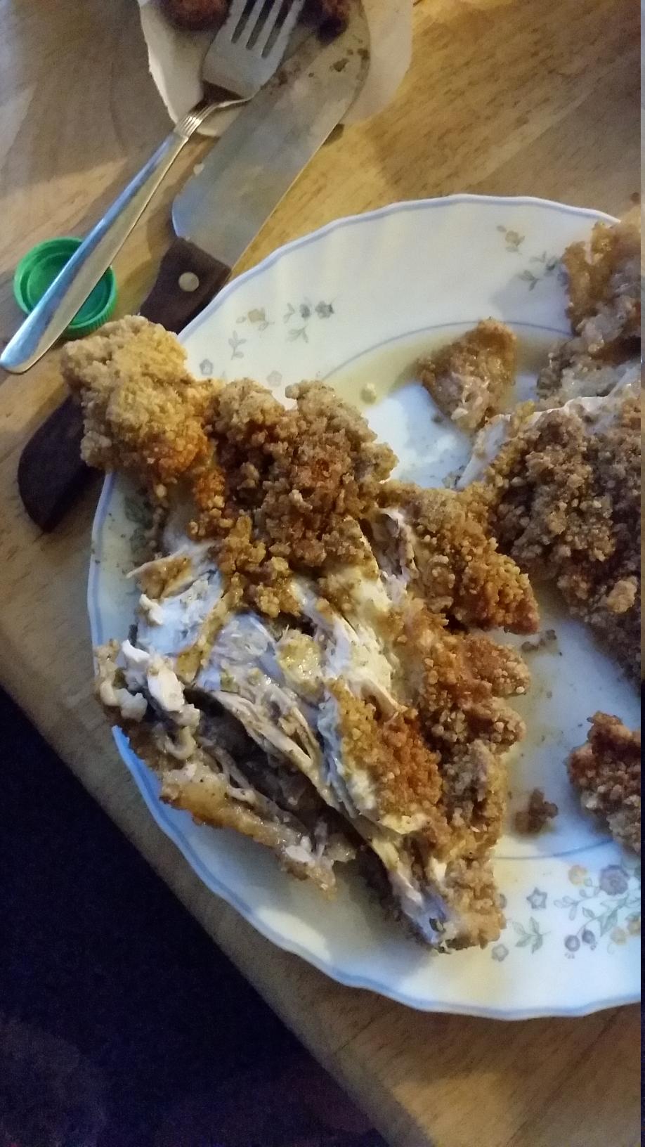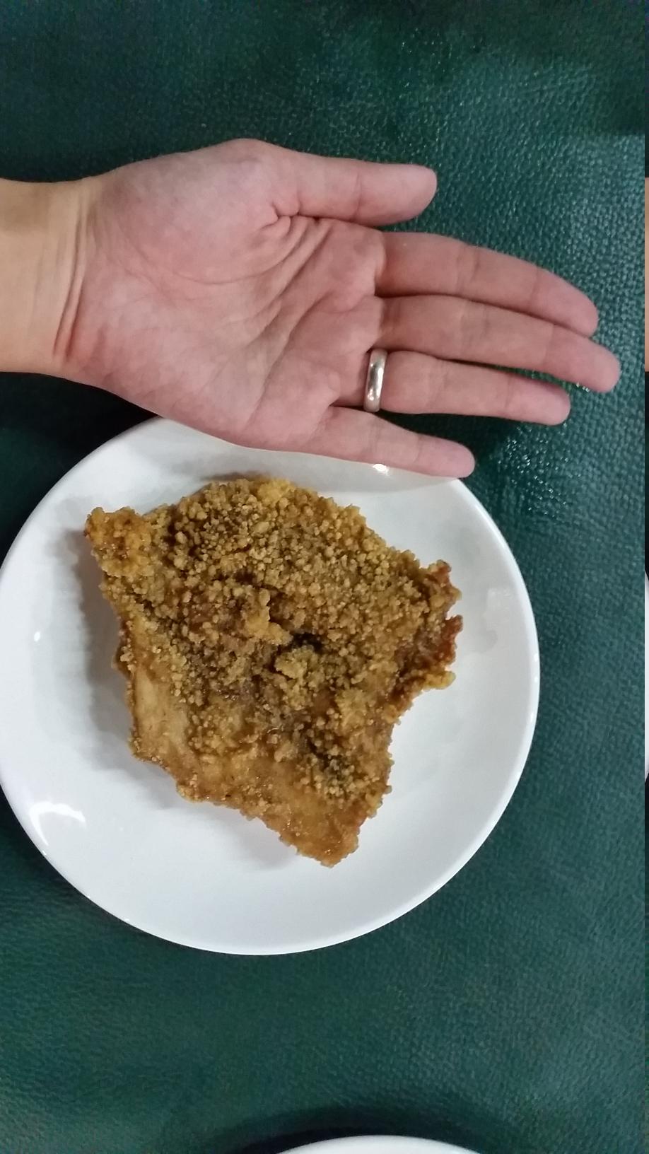 เนื้อไก่ก็ชุ่มดี ไม่ได้แห้งมาก แต่ไม่มีรสชาติอะไร เหมือนไม่ได้หมัก ส่วนแป้งก็เป็นแป้งกรอบๆ ที่เป็นเกล็ด