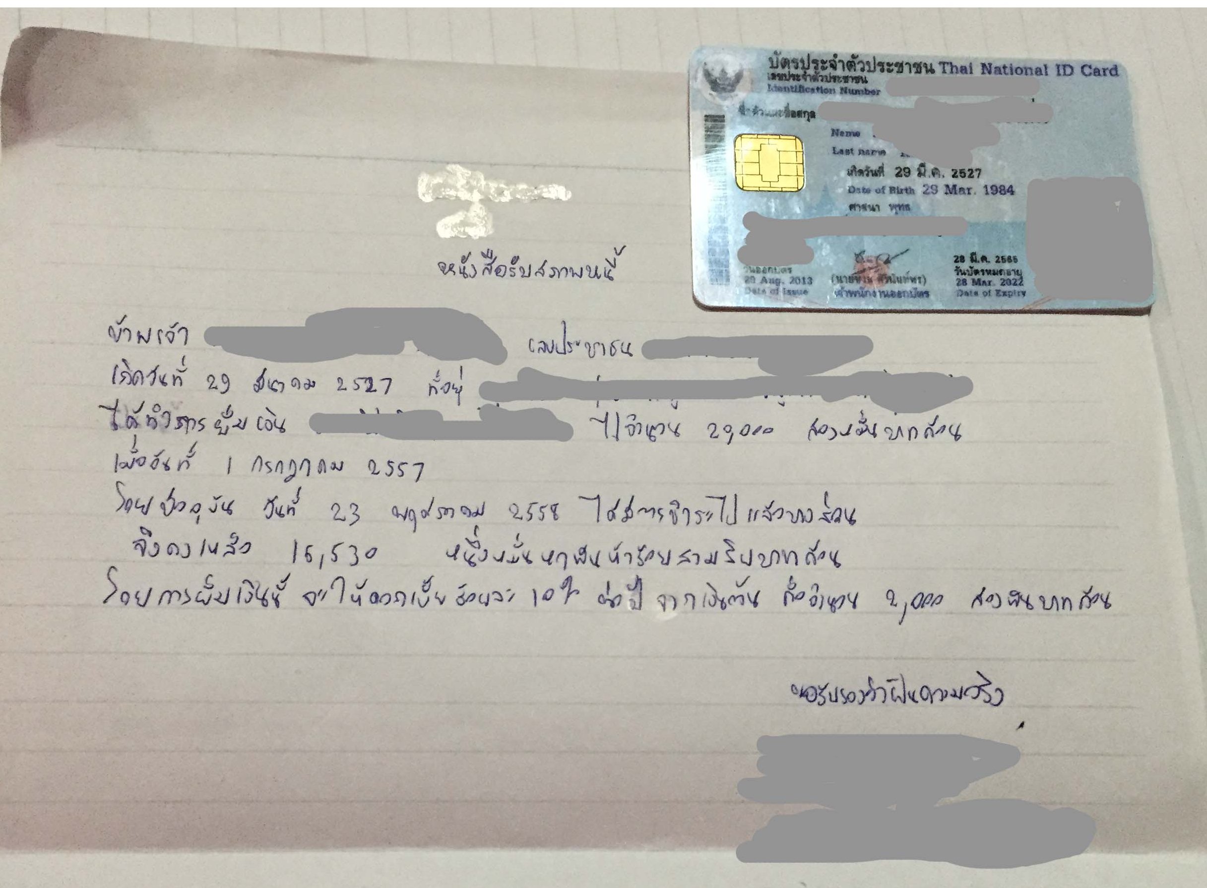 หนูเลยทำหนังสือรับสภาพหนี้ให้เค้าเซ็นต์ เค้าก็เซ็นต์ค่ะ แต่ไม่ได้แนบสำเนาบัตรประชาชน