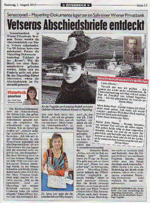 พอดูตอนนี้จบก็เลยดูมันทั้งเรื่องจนถึงตอนจบที่ท่านทำอัตวิบาตกรรมกับ Mery Veteras ดูเรื่องนี้หลายรอบแล้วค่ะมีทั้งซึ้ง โรแมนติก เศร้า และประวัติศาสตร์ ถ้าวันนั้น Kaiser Franz เชื่อ Crown Prince Rudolf สงครามโลกครั้งที่สองอาจจะไม่มีเกิดหรือเปล่าต่างคิดไปกันต่างๆนานา ดูเสร็จก็คุยกับสามีซึ่งเป็นชาวเวียนนาวิจารณ์กันไปมาตั้งแต่เมื่อคืน พอมาตอนเช้าวันนี้สามีส่งเมล์มาว่านสพ.ที่โน่นลงข่าวค้นพบจดหมายลาตายของMary Vetseras ถึงแม่ น้องชาย แล้วก็น้องสาวในเซฟของธนาคาร private Schoellerbankในขณะที่ธนาคารกำลังเคลียร์เซฟที่ไม่มีผู้ติดต่อมาเป็นเวลากว่า90ปีโชคดีที่ผู้พบจดหมายเป็นผู้ที่รู้ประวัติศาสตร์ไม่งั้นจดหมายเหล่านี้คงลงถังขยะแน่เรามาดูรูปจดหมายกันเลยดีกว่าค่ะ