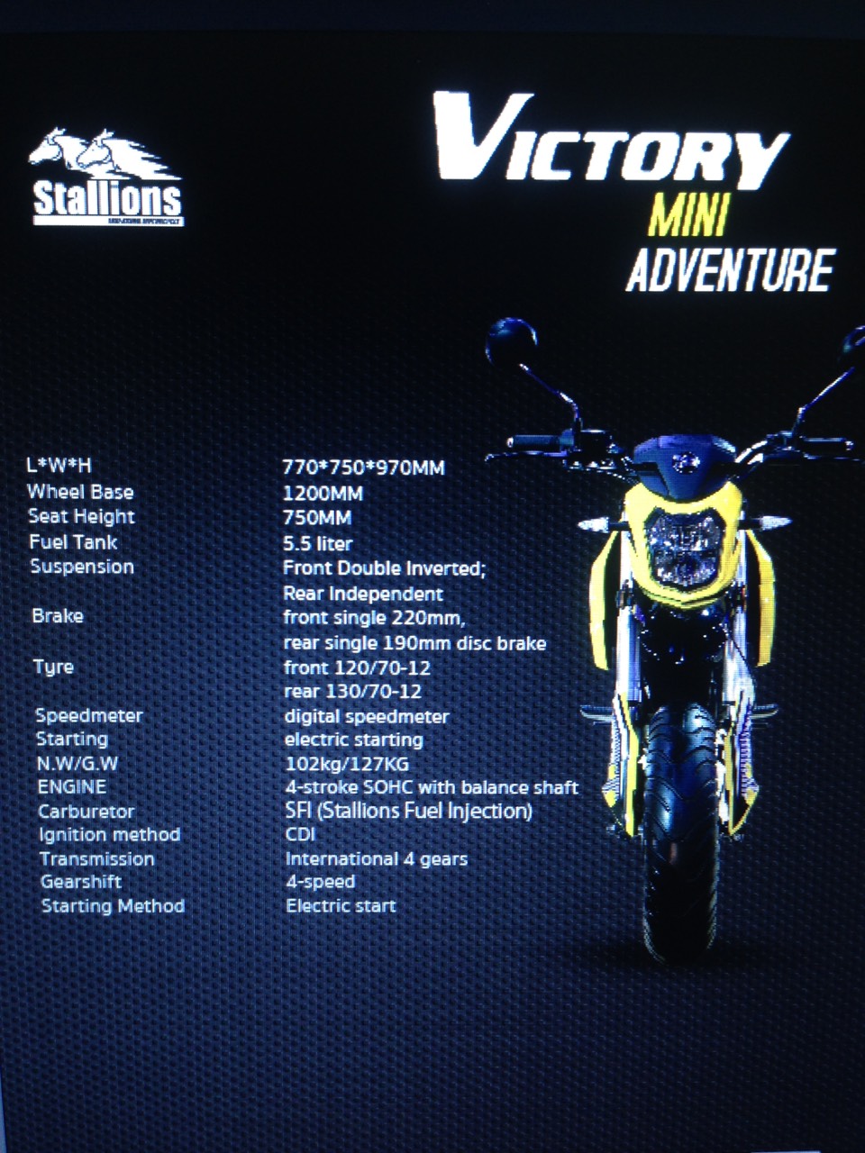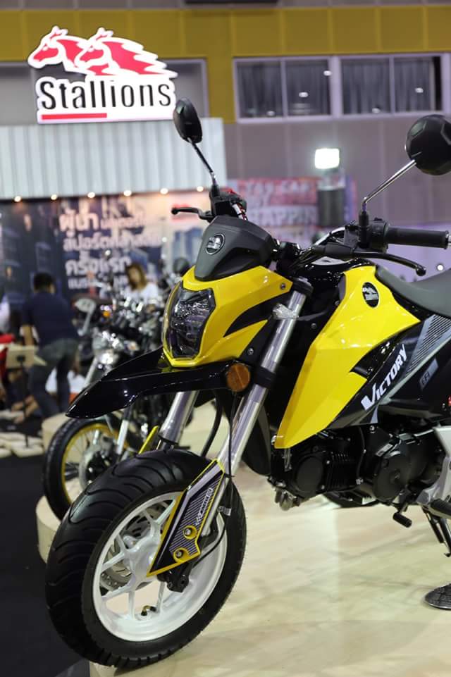 Stallions Victory Mini Adventure 125c.c. สูบนอน ระบายความร้อนด้วยอากาศ จ่ายเชื้อเพลิงด้วยระบบหัวฉีดคันแรกของค่ายStallions เรือนไมล์แสดงผลแบบดิจิม่อน ไฟหน้าไฟเลี้ยวLEDรอบคัน โช๊คหน้าหัวกลับ โช๊คหลังเดี่ยว ดิสก์เบรคหน้า/หลัง ล้อแม๊กซ์12นิ้ว พร้อมยางTubeless ท่อไอเสียสแตนเลสทั้งเส้นในราคา45,900บ