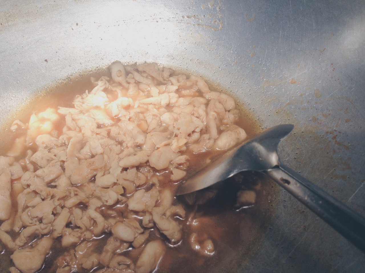 2. นำไก่มาหั่นชิ้นพอดีคำ ใส่น้ำมันตั้งกะทะให้ร้อน นำไก่ลงไปผัดให้สุดพร้อมปรุงรสด้วยน้ำมันหอยและซีอิ๋วขาว ผัดไก่ให้สุกใา่น้ำพอขลุกขลิก