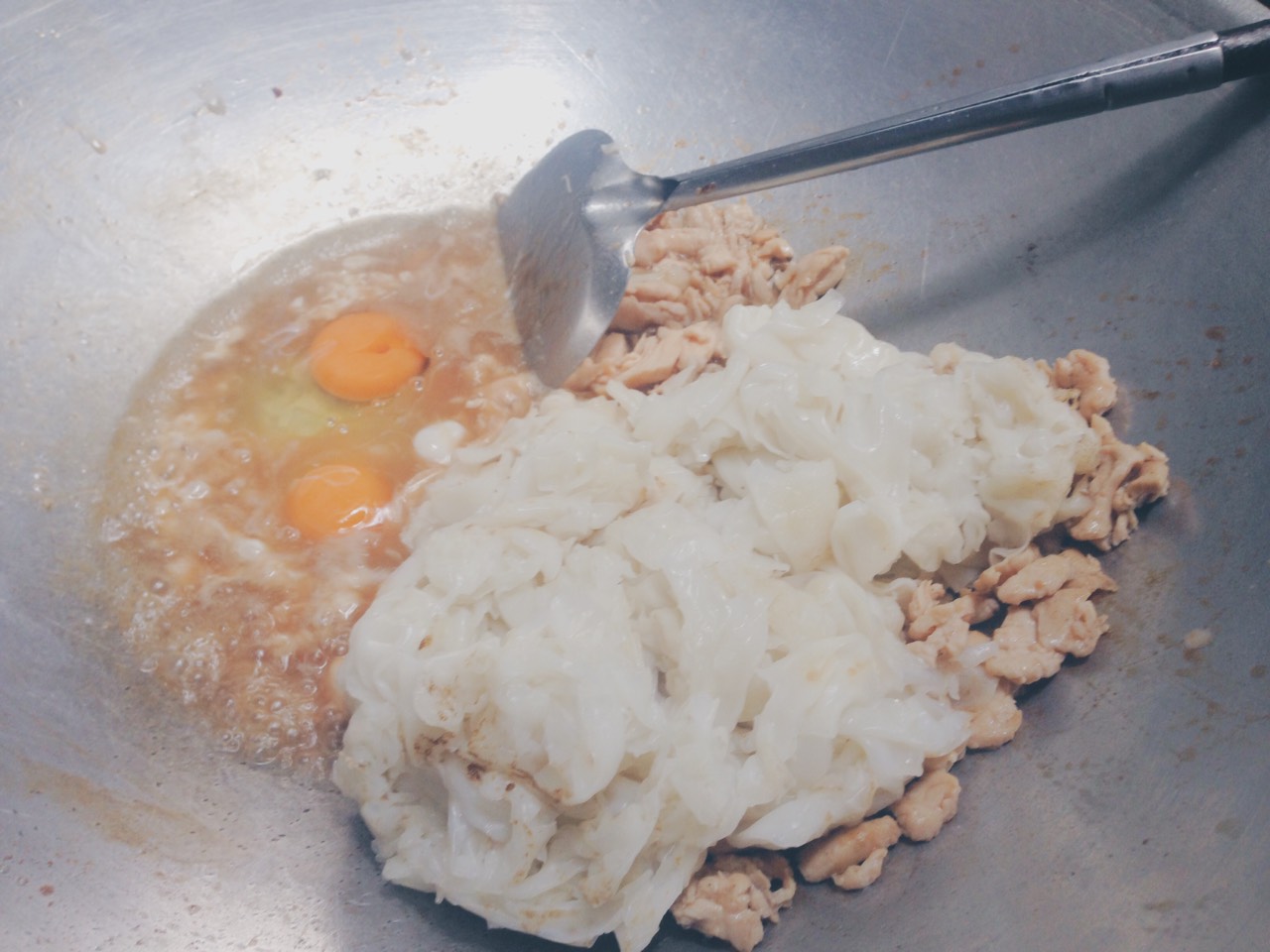 3. จากนั้นทำหลุมตรงเนือไก่แล้วตอกไข่ไก่ใส่ลงไป ผัดให้ไข่สุกเล็กน้อย และนำก๋วยเตี๋ยวเส้นใหญ่ลงไปผัด คั่วไปเรื่อยๆจนเส้นเหลืองหอม