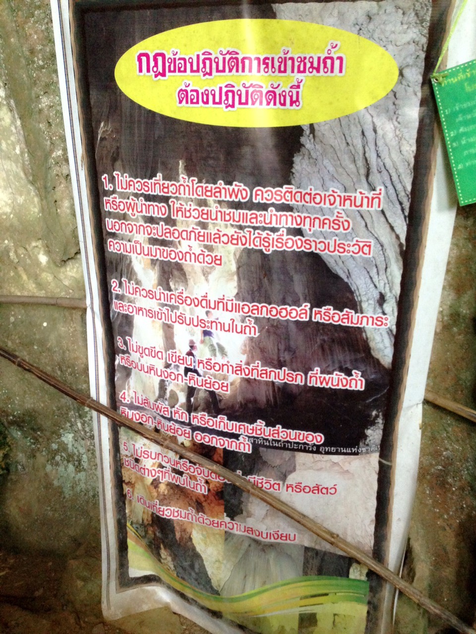 มาถึงจุดจอดเรือเพื่อที่ต้องเดินขึ้นไปบนถ้ำ จะพบกับคำเตือนและข้อห้าม ลุงชาบอกเราว่าอย่าเอามือไปจับของในถ้ำเพราะจะทำให้มันหยุดโต กว่าที่มันจะหยดเป็นได้ขนาดนี้ 1ปี มีแค่3 มิลลิลิตรเอง กว่าที่มันจะได้รูปลักแบบนี้