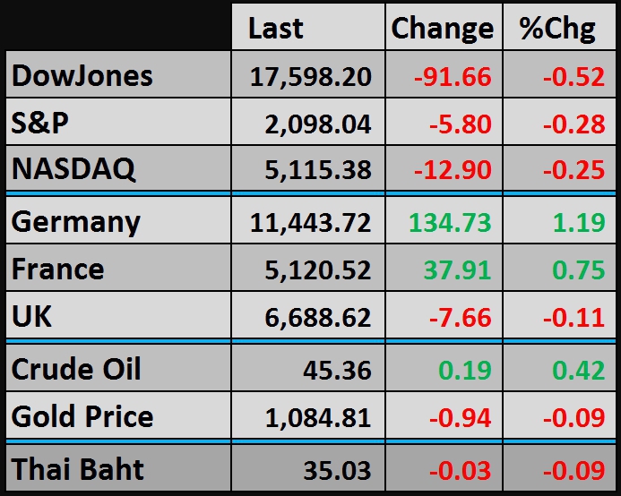 ดัชนีเฉลี่ยอุตสาหกรรมดาวโจนส์ปิดที่ 17,598.20 จุด ลดลง 91.66 จุด หรือ -0.52% ดัชนี NASDAQ ปิดที่ 5,115.38 จุด ลดลง 12.90 จุด หรือ -0.25% ดัชนี S&P500 ปิดที่ 2,098.04 จุด ลดลง 5.80 จุด หรือ -0.28%