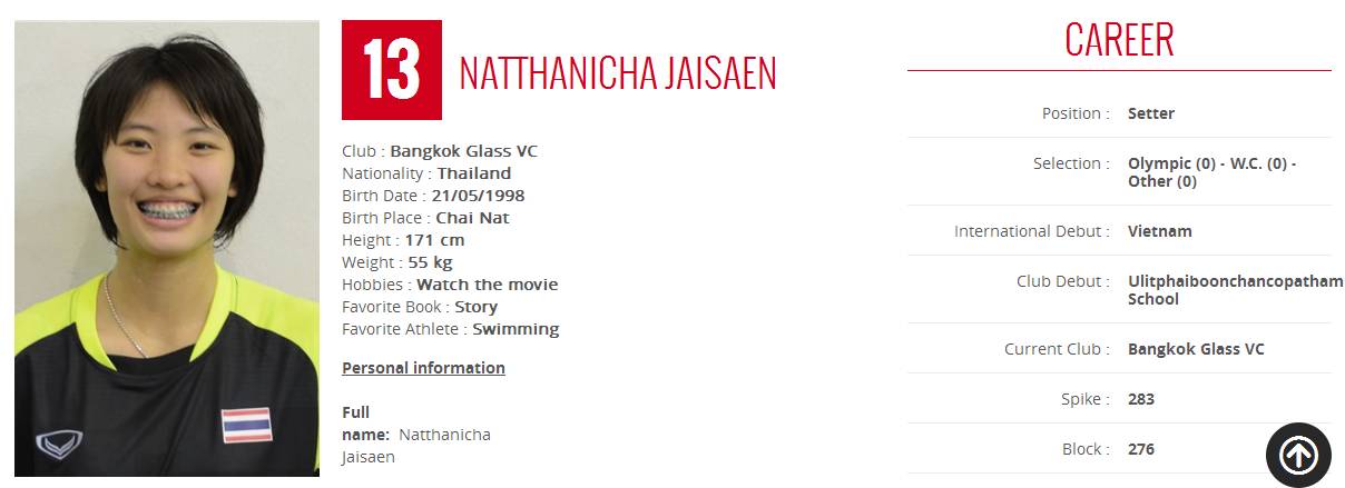 หมายเลข 13 ณัฏฐณิชา ใจแสน-นุ๊กนิก หัวหน้าทีม อายุ 17 ปี สูง 171 cm ตำแหน่ง Setter