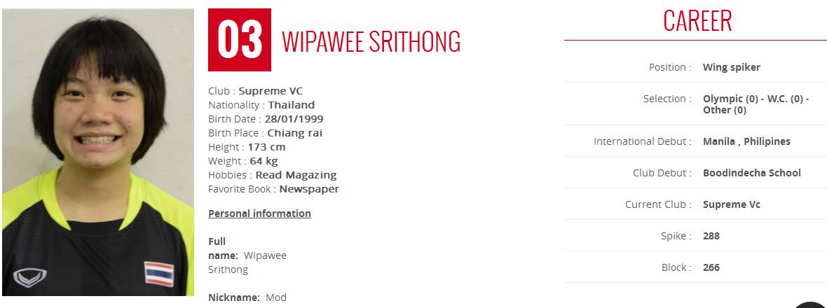 หมายเลข 3 วิภาวี ศรีทอง-มดด๋อย อายุ 16 ปี สูง 173 cm มือตบประจำทีม
