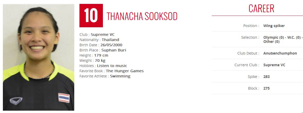 หมายเลข 10 ธนัชชา สุขสด-โมเม อายุ 15 ปี สูง 179 cm ดาวรุ่งมือตบประจำทีม