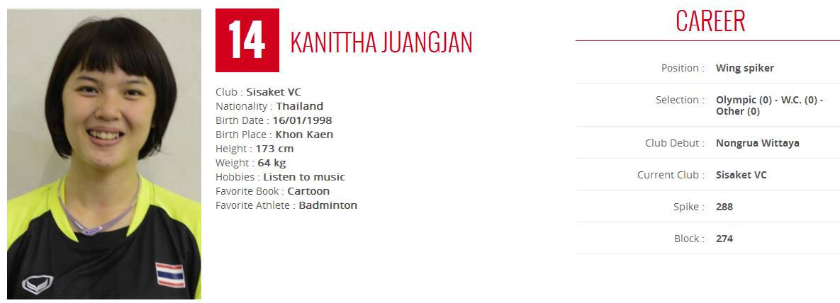 หมายเลข 14 ขนิษฐา จวงจันทร์-มดจวง อายุ 17 ปี สูง 173 cm มือตบประจำทีม