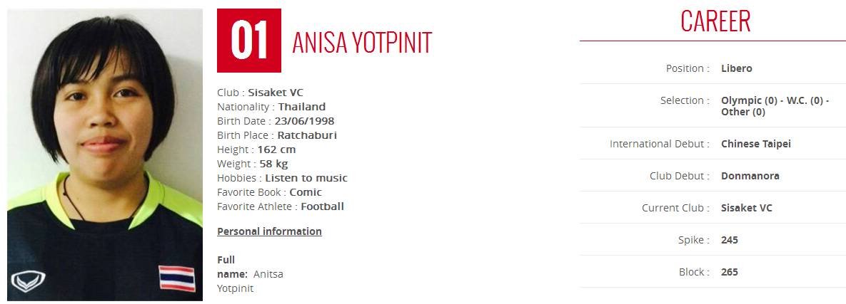 หมายเลข 1 อนิสา ยอดพินิจ-น้ำหวาน อายุ 17 ปี สูง 162 cm ตำแหน่งลิเบอโร่