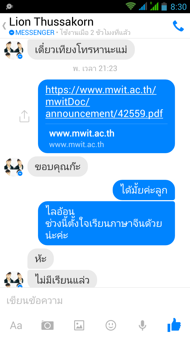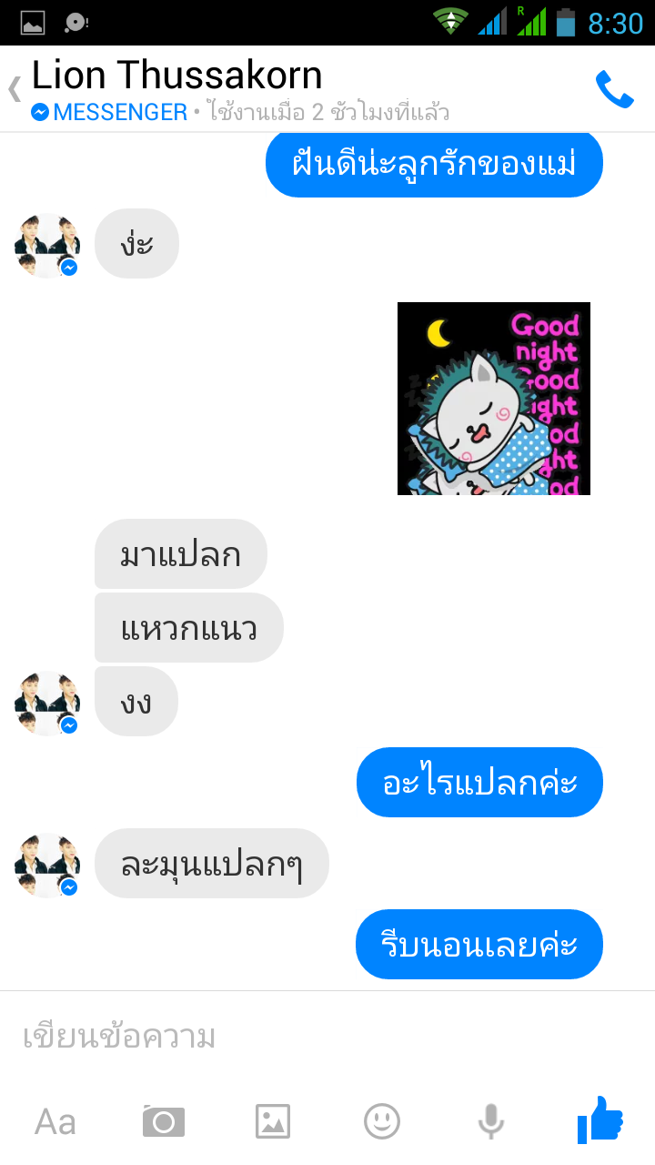 ปกติเราจะโทรคุยกันเพราะ ดิฉันขี้เกียจพิม ตาก็ไม่ค่อยดี แต่เมื่อวานนี้คุย Massenger กัน ก็ตั้งใจว่าจะคุยกะลูกเพราะๆค่ะ