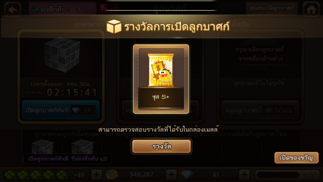 เปิดอีเว้นท์มาชนะ x5 ได้ลูกบาศก์แตงโมมา 1 ลูก จับยัดผง ใช้เพชรเปิดทันที รางวัลที่ได้รับ คือ..... อีกรูปค่ะ แค่นี้ก็ดีใจมากๆแล้วค่าาา อีเว้นท์วันแรกๆ น่าจะเปิดได้ของดีดีกันเนอะ ใครได้อะไร เอาม